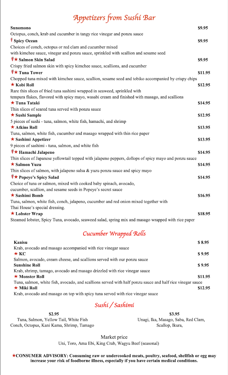 Served raw. Tuna, salmon white fish, cucumber, and masago wrapped with tin rice paper